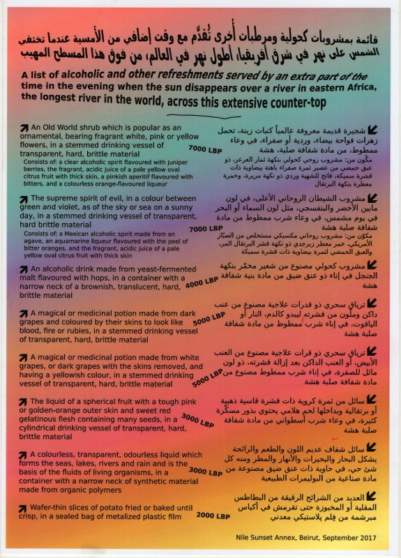 Mophradat and Beirut Art Center invited the public for an evening of music to celebrate many new beginnings—of autumn, of songs, of ideas, and of collaborations. The evening featured music by Concert and The Dwarves of East Agouza and was followed by dancing to the tunes of DJ Jana Saleh. During the evening, as part of their ongoing glossary project for Mophradat’s website, the Cairo-based art collective Nile Sunset Annex presented the latest glossary term: bar.