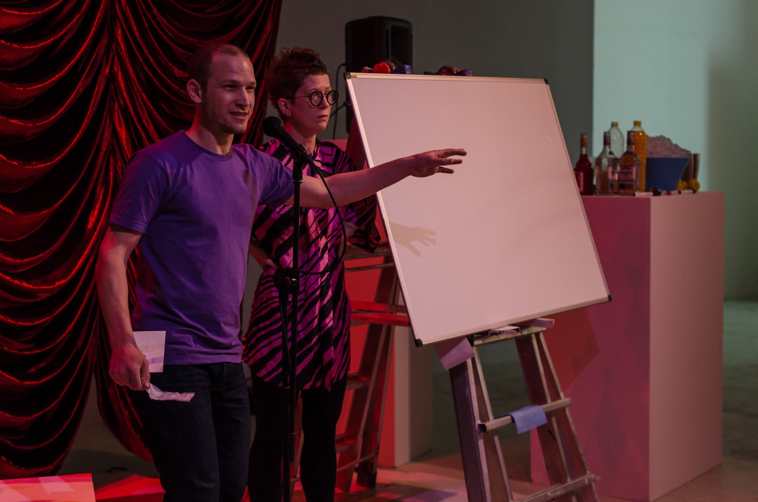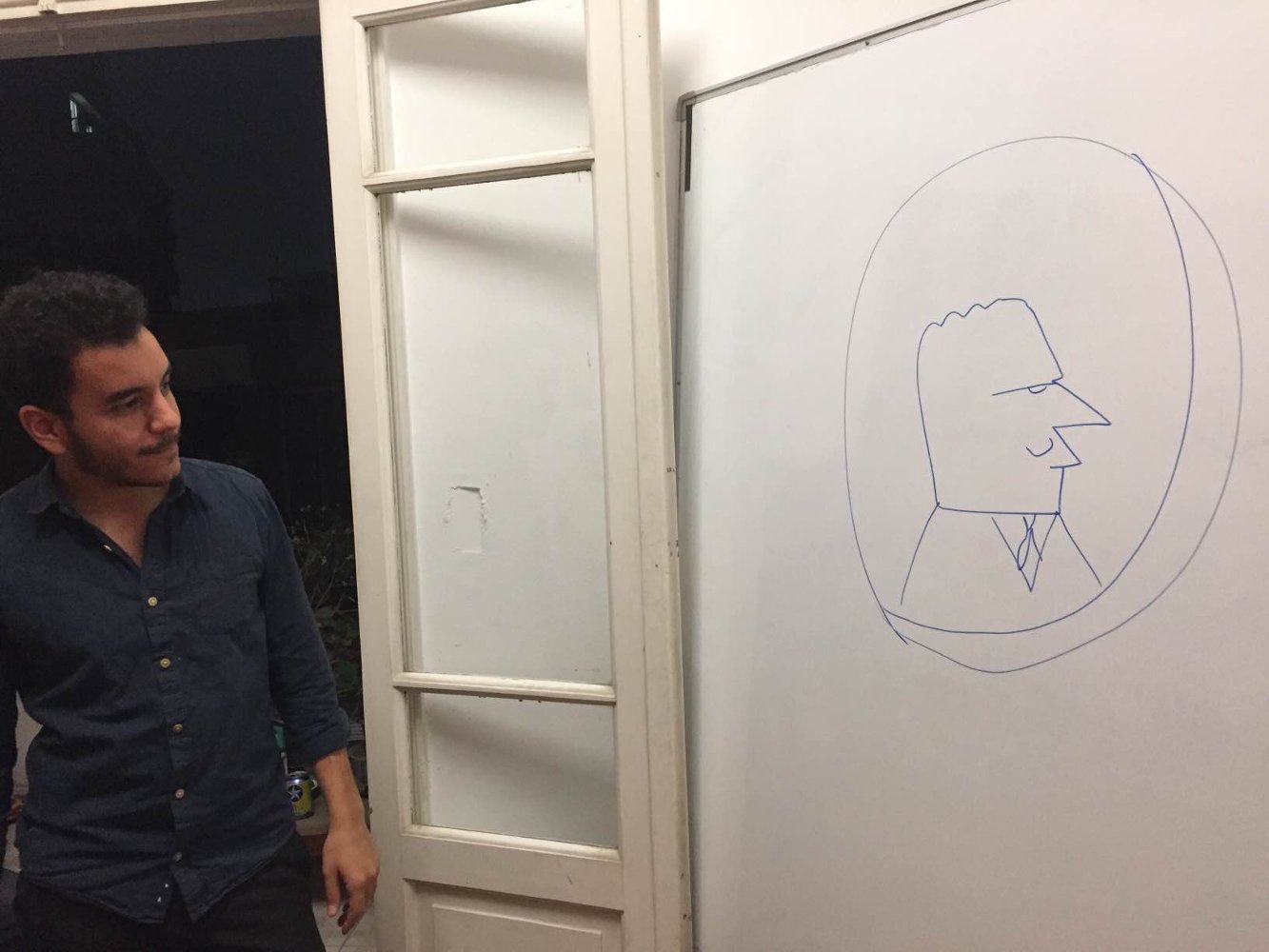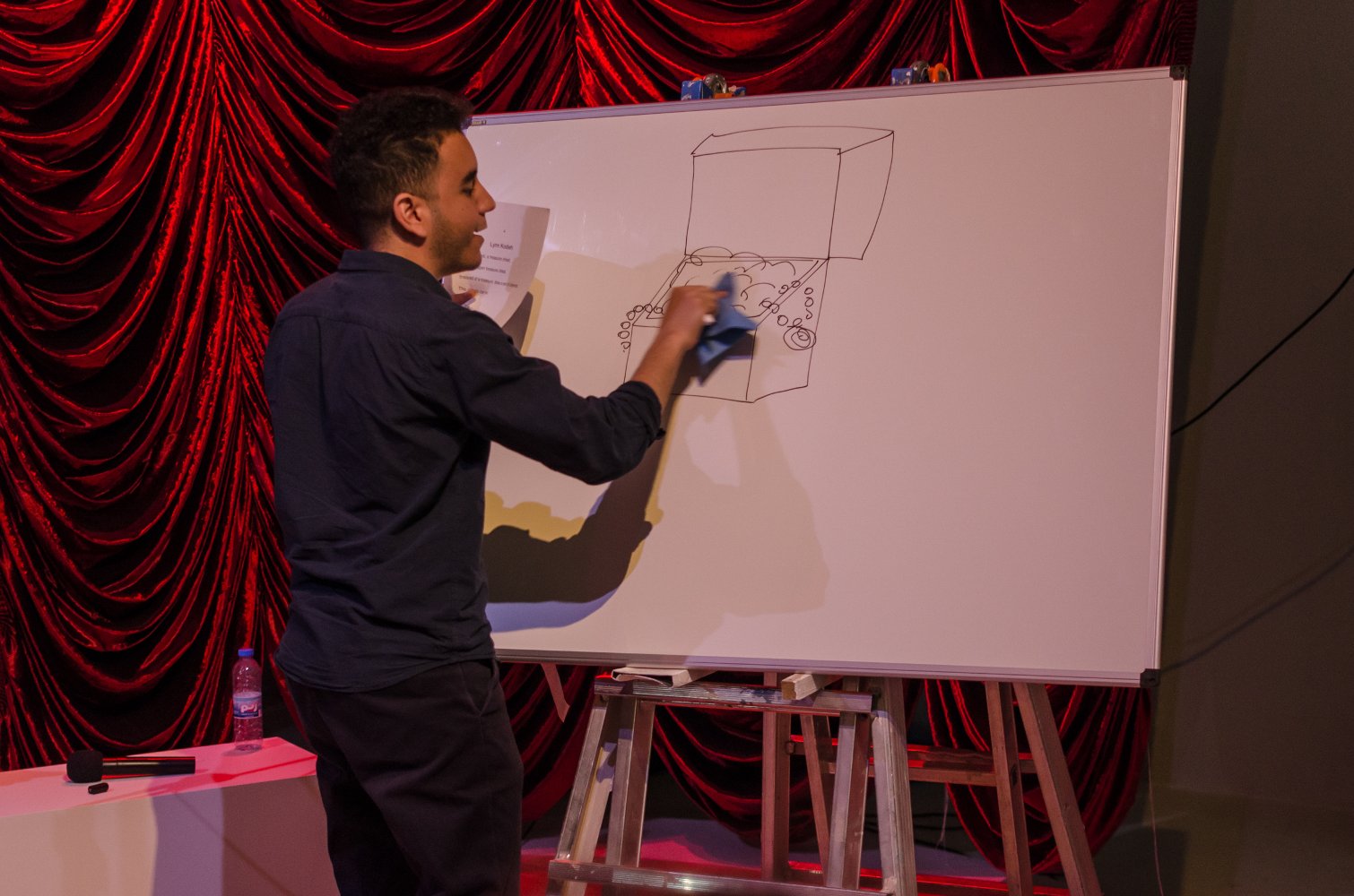 We had English and Arabic words for 28 letters (one for each letter in the Arabic alphabet) and a big whiteboard. For each word, the cartoonist Andeel had a certain length of time to draw from a diverse set of instructions by commissioned artists and writers, who gave us instructions on how to draw that word. The audience shouted out what they thought the word was, and whoever shouted out the right answer won whatever cocktail was being made.