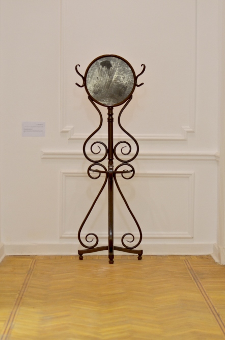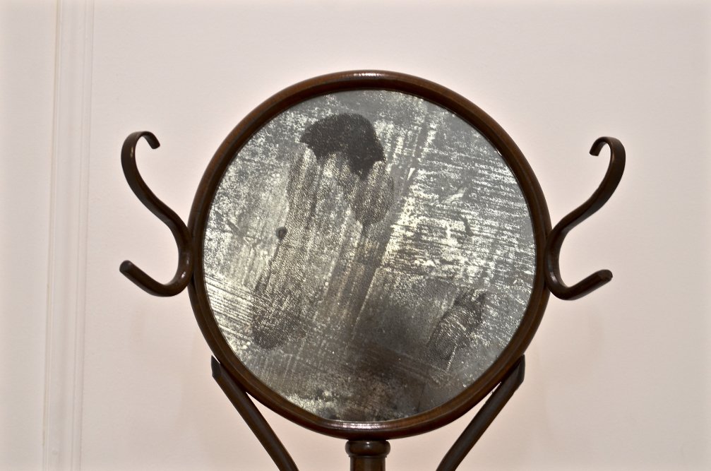 Hassan Khan, DOUBLEMIRROR (dream / object / echo), 2015, two glass mirrors, brass stand, wooden frame, mud and straw head, 121 x 46 cm.