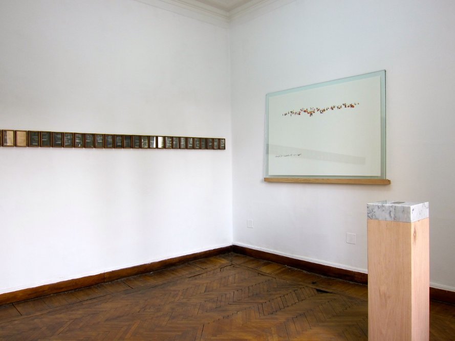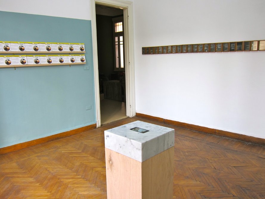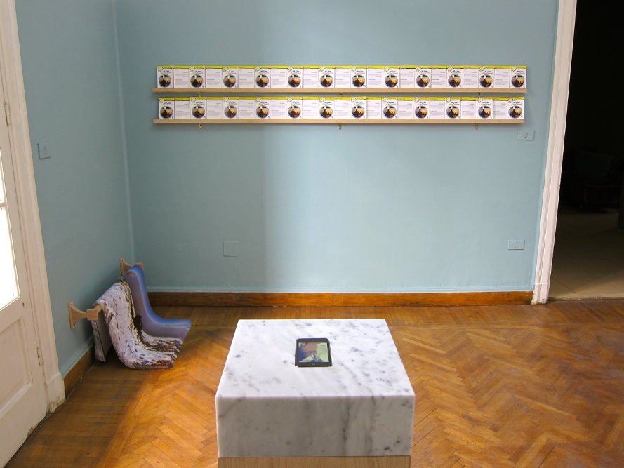 It’s Never Too Late to Talk About Love is a solo exhibition by Mahmoud Khaled. On show are Khaled's most recent works, five projects talking in tandem about dreams, romance, and vulnerability. Wavering between personal and social registers, the pieces are composed of elements as diverse as marble, newsprint posters, iPhone screenshots, and a song by Jacques Brel. Strong material presence combines with the virtual to create an aesthetic at once austere and extravagant.