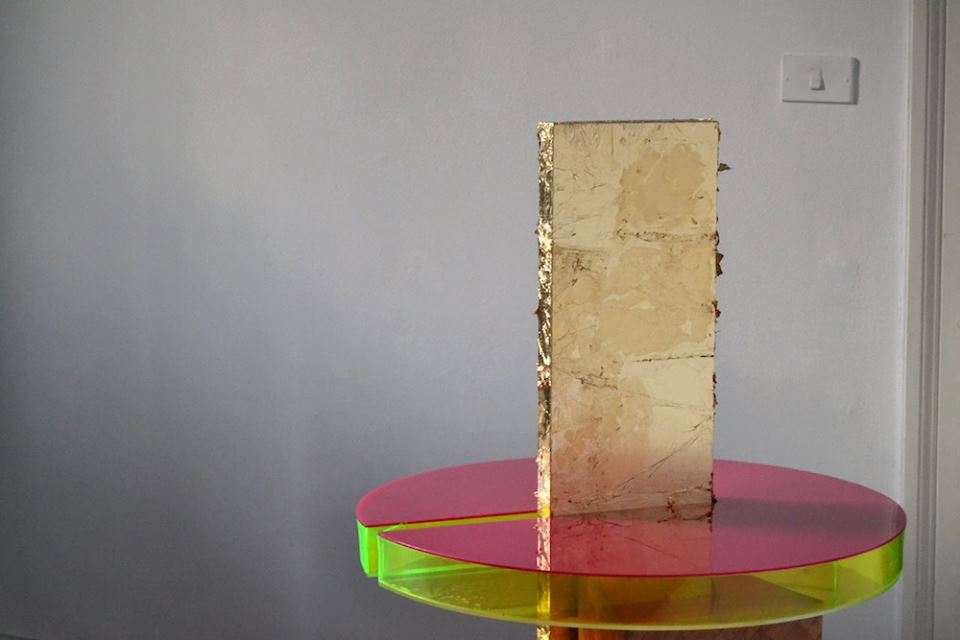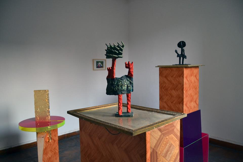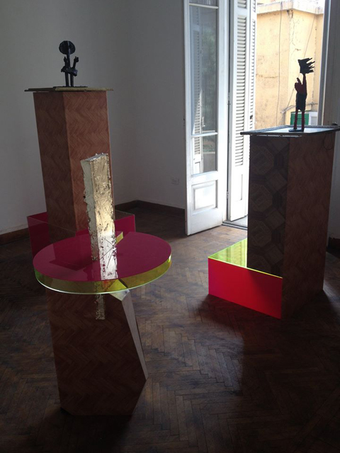 Two metal sculptures by Sobhy Guirguis (1929-2013) balance on two different, vivacious pedestal sculptures by Mariam Elias and Paradoxia, made with gold leaf, wood veneer and colored perspex.