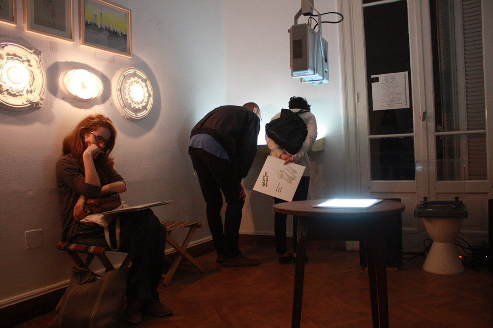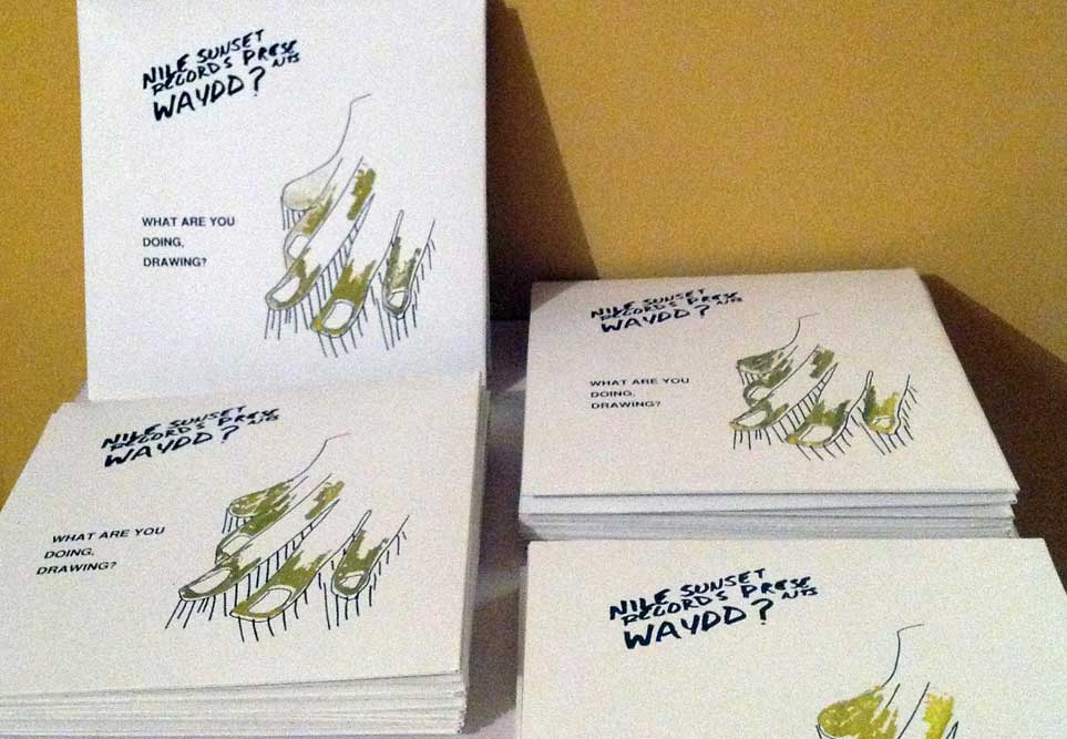 We asked various artists and musicians to make sound in response to each of the works in the exhibition "What Are You Doing, Drawing?" Each response is a track on a dubplate record. We played the record and gave away record sleeves at the launch.