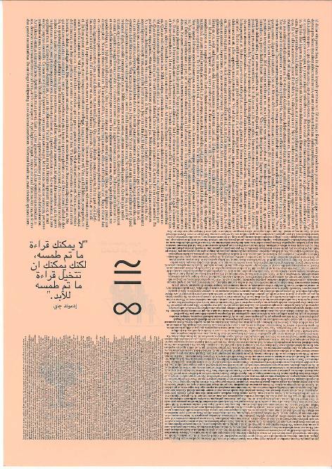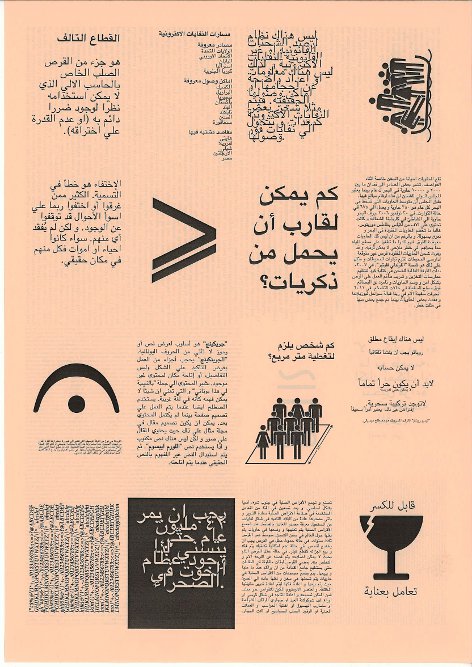 المطبوعة #5: غرفة مليئة بالذكريات The fifth publication accompanied Take To The Sea’s solo exhibition “A Roomful of Lost Memory” that took place from September 21 to October 19 2013. The publication contains content by Take To The Sea in both Arabic and English, with design elements by Andeel. المطبوعة الخامسة مصاحبة لمعرض للبحر در الفردي "غرفة مليئة بالذكريات" الذي أقيم في الفترة من 21 سبتمبر إلى 19 أكتوبر ٢٠١٣. المطبوعة تتضمّن نصوص للبحر در بالعربية والإنجليزية، بالإضافة إلى عناصر تصميمية ل أنديل. |