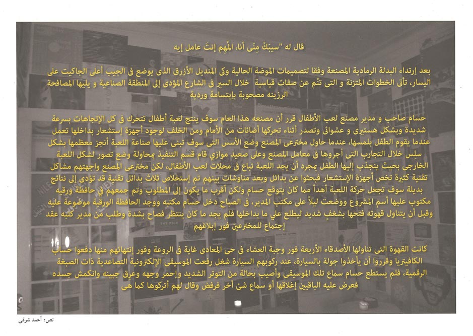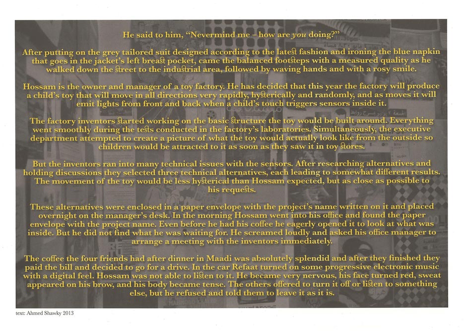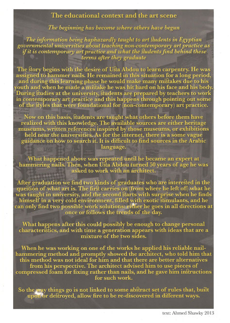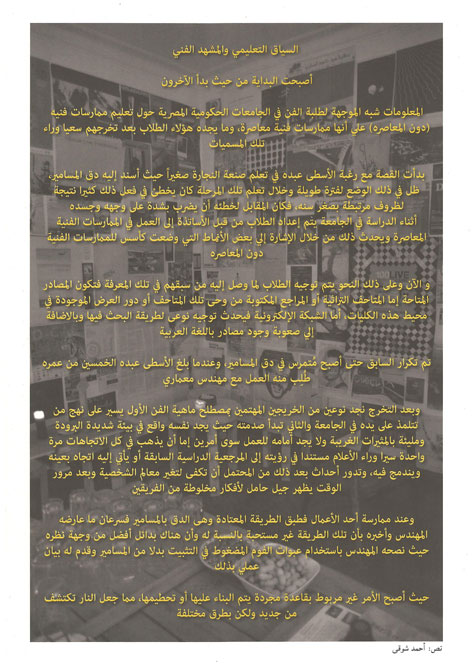 Four laminated posters accompanying the Art Bar, with writing by artist Ahmed Shawky.